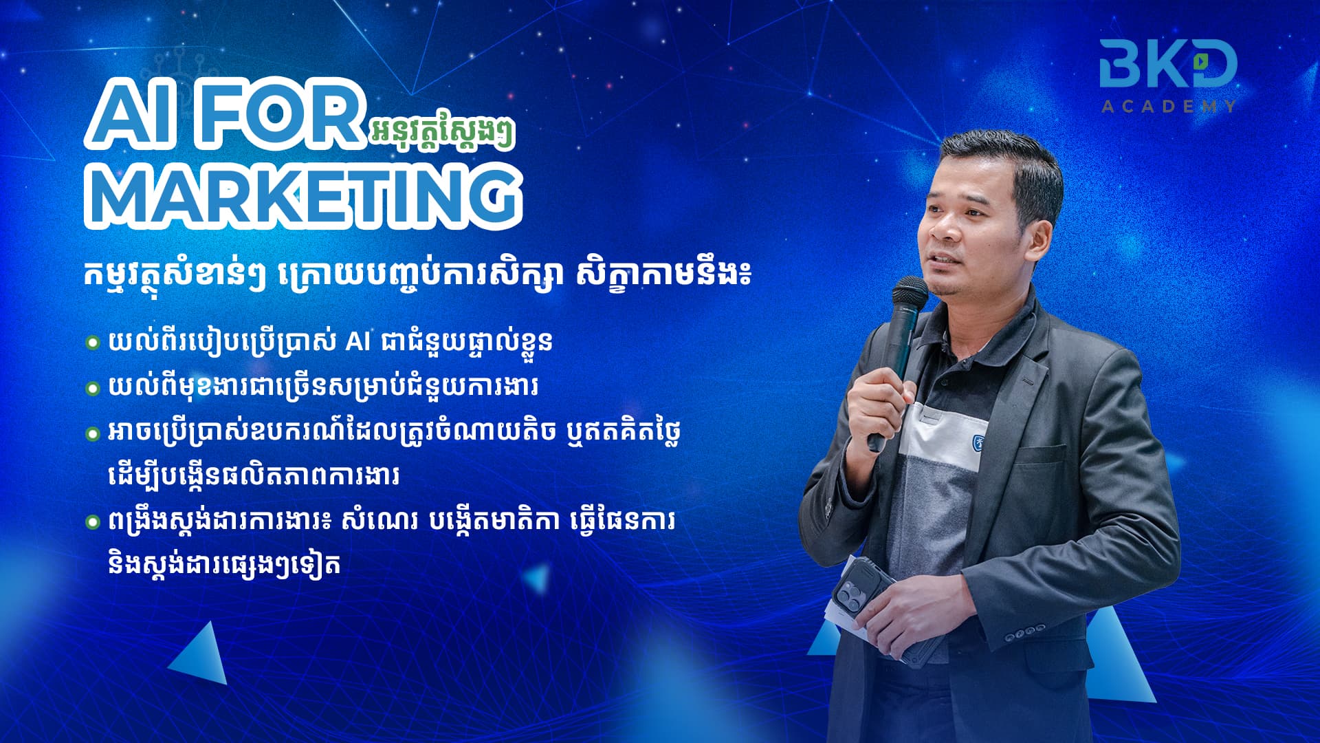 បញ្ញាសិប្បនិម្មិត្ត (Artificial Intelligence-AI) កំពុងតែបោះជំហានទៅមុខយ៉ាងលឿដែលសហគ្រាសខ្នាតតូចនិងមធ្យម (MSMEs) ភាគច្រើន នៅមិនទាន់បានប្រើប្រាស់មុខងារជាច្រើនរបស់បច្ចេកវិទ្យាទាំងអស់នេះបានទូលំទូលាយនៅឡើយ។ ក្រៅពីរៀបចំកម្មវិធីបណ្ដុះបណ្ដាលវគ្គសិក្សាដ៏ពិសេសដោយផ្ទាល់ ឥឡូវនេះ យើងអាចសិក្សានៅលើសាលាអនឡាញនេះបាន។ កម្មវិធី AI for Marketing and Work នេះជាវគ្គបណ្ដុះបណ្ដាលដែលសំខាន់សម្រាប់ទាំងនិយោជិត និងនិយោជក ក្នុងស្ថានភាពនៃការប្រកួតប្រជែងគ្នាដ៏តានតឹងនេះ។