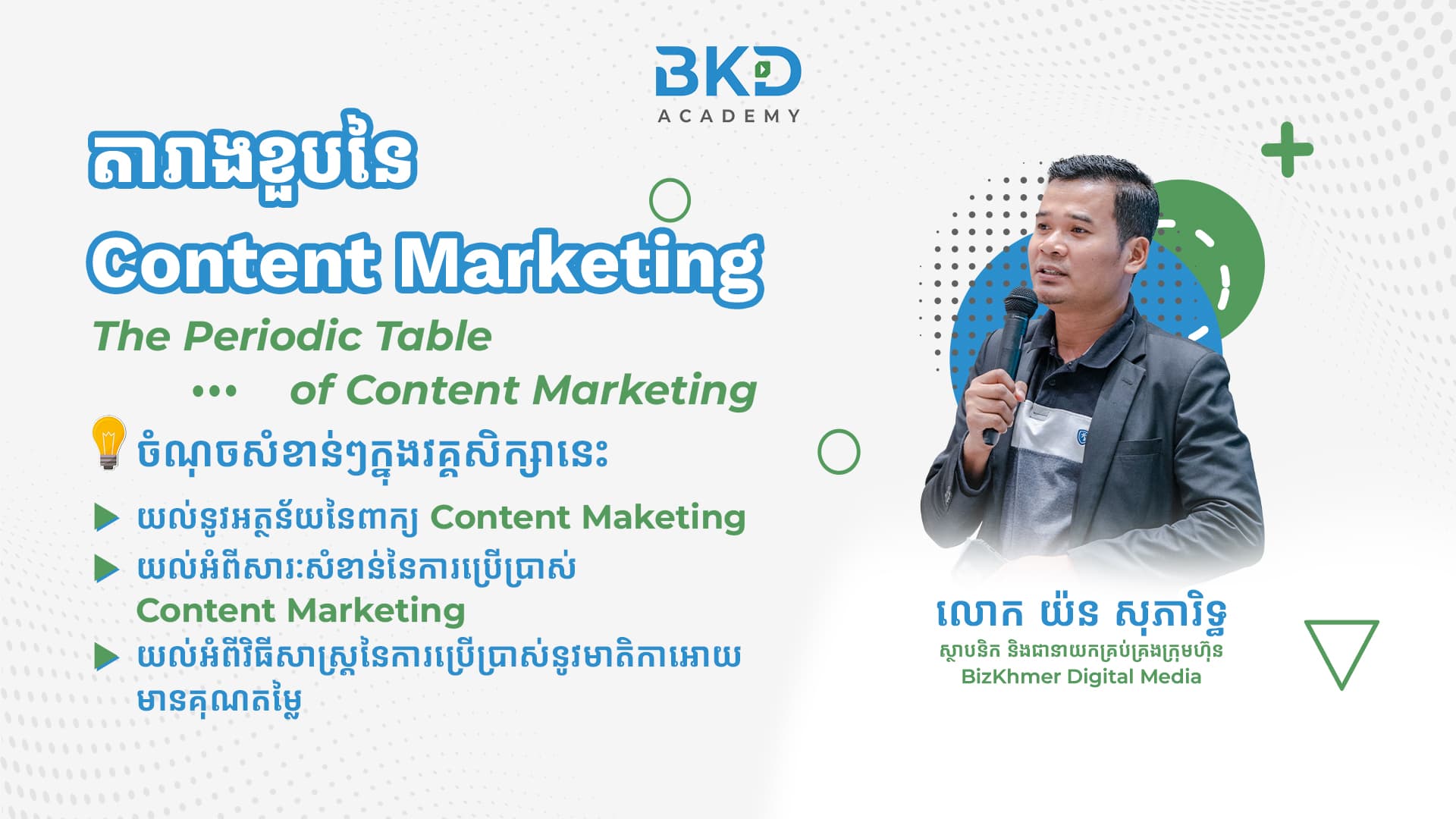 សូមចូលរួមក្នុងវីដេអូថ្មីបំផុតរបស់យើងដែលមានលោក យ៉ន សុភារិទ្ធ នាយកគ្រប់គ្រងនៃ BKD Academy ដែលលោកបានលើកយកធាតុសំខាន់ៗនៃ "តារាងខួបនៃទីផ្សារមាតិកា" ឬ ក៏ហៅថា “The Periodic Table of Content Marketing”។ ក្នុងវគ្គសិក្សាដែលមានរយៈពេល 30 នាទីនេះ លោក យ៉ន សុភារិទ្ធ បានពន្យល់អំពីសមាសធាតុសំខាន់ៗដែលរួមចំណែកដល់យុទ្ធសាស្ត្រមាតិកាដ៏ជោគជ័យ និងរបៀបប្រើប្រាស់ឲ្យបានត្រឹមត្រូវ។