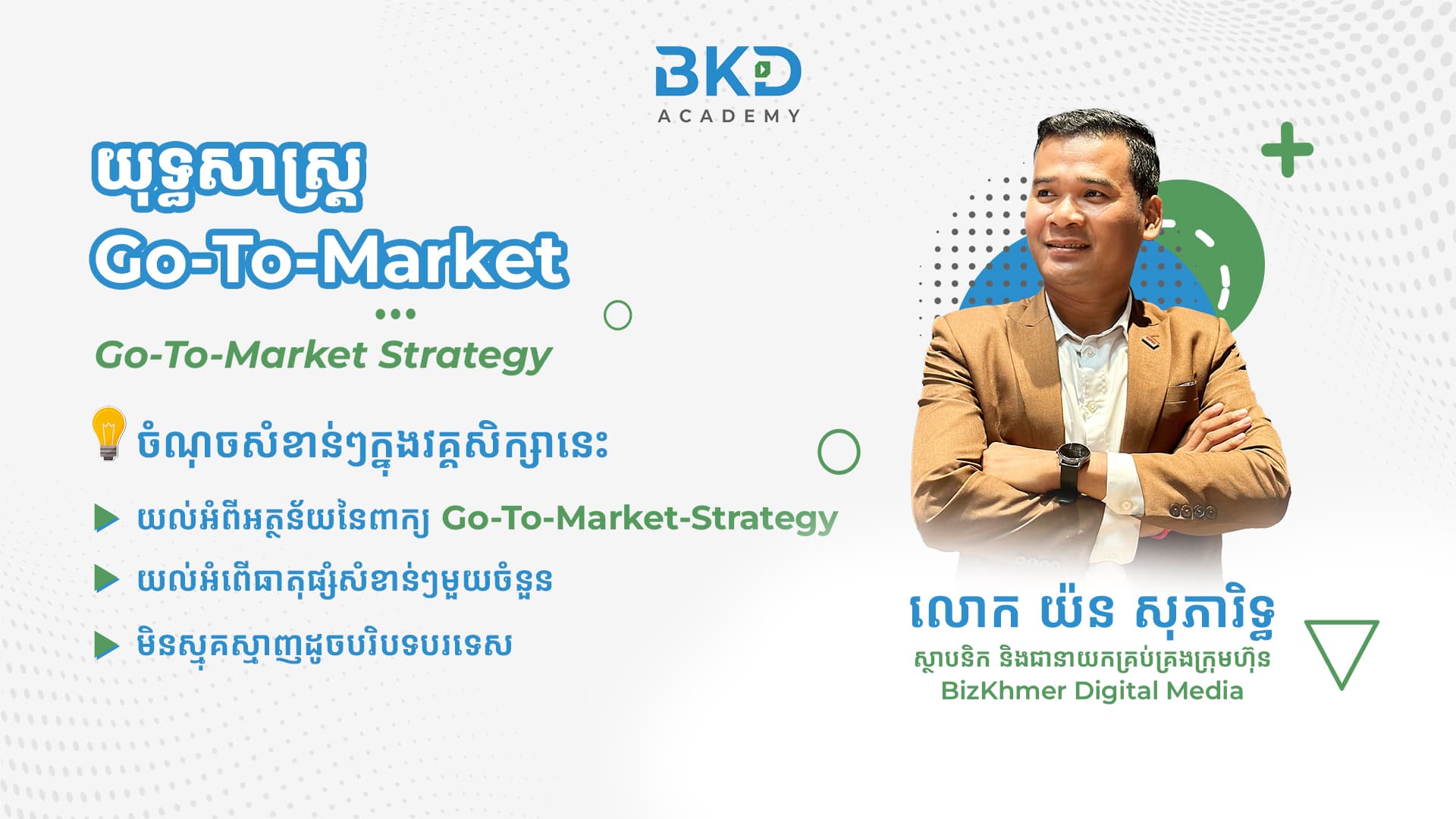 «យុទ្ធសាស្ត្រចូលទីផ្សារ» ឬហៅភាសាអង់គ្លេសថា Go-to-Market Strategy ជាប្រធានបទធំមួយដែលម្ចាស់សហគ្រាសខ្នាតតូចនិងមធ្យមក៏ដូចជាបុគ្គលិកអាជីពនៅក្នុងវិស័យ Marketing គួរតែឈ្វេងយល់អំពីការរៀបចំផែនការលម្អិតសម្រាប់ការដាក់ចេញនូវផលិតផល ឬសេវាកម្មថ្មីមួយ ទៅកាន់់ទីផ្សារ។ ស្ដាប់មើលទៅ វាហាក់ដូចជារឿងធម្មតា សម្រាប់អ្នករៀបចំយុទ្ធសាស្ត្រឬក៏អ្នកធ្វើផែនការ ដែលជាការពិត វាមានធាតុផ្សំជាច្រើន ដែលនៅក្នុងនោះ ការឆ្វេងយល់អំពីទីផ្សារដែលរួមមាន អតិថិជនគោលដៅឲ្យបានច្បាស់ ទំហំទីផ្សារដែលខ្លួនត្រូវចាប់យក សក្ដានុពលនៃទំហំទីផ្សាររបស់យើង ការឆ្វេងយល់អំពីប្រភពព័ត៌មានដើម្បីទទួលបាននូវព័ត៌មានទីផ្សារនិងទំហំទីផ្សារ និងការរៀបចំផែនការលម្អិតរាប់ចាប់តាំងពីការប្រមូលផ្ដុំនៃគំនិតបង្កើត ឬផលិត ផលិតផល រហូតដល់ការឌីហ្សាញ ផលិត និងដាក់ចេញនៅលើទីផ្សារ ដោយរៀបចំក្រុមការងារស្នូលនិងពាក់ព័ន្ធ សម្រាប់ការវាយលុយចូលទីផ្សារជាមួយព័ត៌មានច្បាស់លាស់។ នៅក្នុងមេរៀននេះ លោក យ៉ន សុភារិទ្ធ ស្ថាបនិករបស់យើង នឹងពន្យល់លម្អិត អមជាមួយនឹងទម្រង់€កសារដែលមានការរៀបចំយ៉ាងលម្អិត និងច្បាស់លាស់។