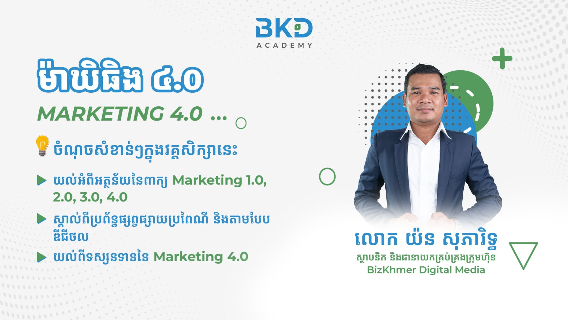 ម៉ាឃិធិង 4.0 (Marketing 4.0) គឺជា ប្រធានបទនិងទស្សនៈទានដែលសហគ្រិនក៏ដូចជាអ្នកអាជីពនៅក្នុងវិស័យ marketing គួរឈ្វេងយល់ និងសិក្សាលម្អិតដើម្បីអភិវឌ្ឍក៏ដូចជាទាញយកគោលការណ៍មួយចំនួនដើម្បីយកមកអនុវត្តនៅក្នុងបរិបទនៃប្រទេសកម្ពុជាយើង។ ជាការពិត នៅក្នុងទស្សនៈទាននៃ marketing 4,0 នេះ មានគោលការណ៍ និងចំណុចសំខាន់ៗ ជាច្រើនដែលឆ្លុះបញ្ចាំងអំពីការទទួលយកនិងការច្របាច់បញ្ចូលគ្នានៃទស្សនៈទាន marketing បែប ប្រពៃណីនិងបែបឌីជីថល។ ហើយជាពិសេសផងនោះ ក៏យើងមានរូបមន្តមួយចំនួននៃការបម្លែងនៃ marketing ចម្រុះ (ឬ Marketing Mix) ក្នុងបរិបទ digital ក៏ដូចជាភាពបត់បែនតាមរយៈការរីកចម្រើននៃប្រព័ន្ធ interne។ លោក យ៉ន សុភារិទ្ធ ស្ថាបនិករបស់យើង នឹងធ្វើការចែករំលែកលម្អិតផ្សារភ្ជាប់ជាមួយនឹងឧទាហរណ៍ក្នុងបរិបទនៃប្រទេសកម្ពុជា។ កុំភ្លេចថា ប្រធានបទនេះ ពិតជាមានប្រយោជន៍ដើម្បីធ្វើឌីជីថលនីយកម្មសម្រាប់អាជីវកម្មក៏ដូចជាអាជីពរបស់ខ្លួនឲ្យស្របទៅតាមស្ថានភាពនៃការវិវឌ្ឍនៅក្នុងតំបន់ក៏ដូចជាអន្តរជាតិ។